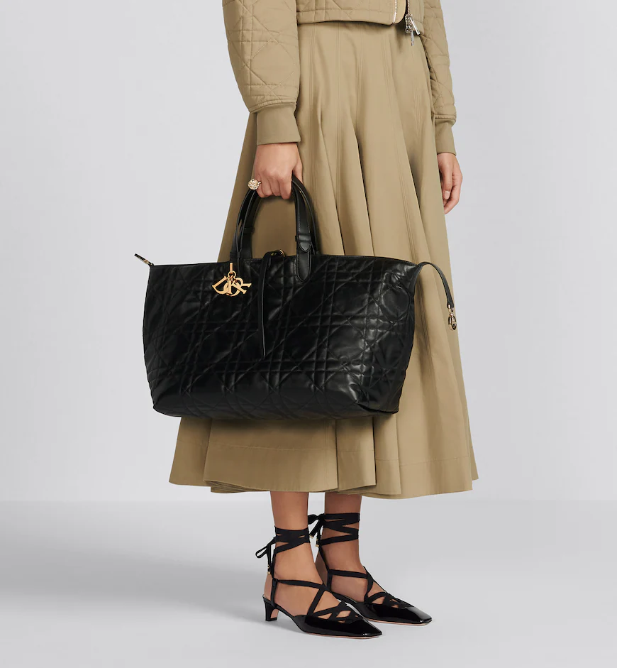 Unveiled at the Spring-Summer 2023 fashion show, the Dior Toujours bag is distinguished by a casual and practical design. Crafted in black calfskin with Macrocannage topstitching, it showcases a spacious interior compartment with a matching pouch to organize essentials. Its leather strap closure keeps items secure while the D of the CD Lock closure twists to adjust the sides and enhance the bag’s silhouette. The leather handles can be adjusted using the small notches in order to be able to carry the large bag by hand or wear it over the shoulder.
