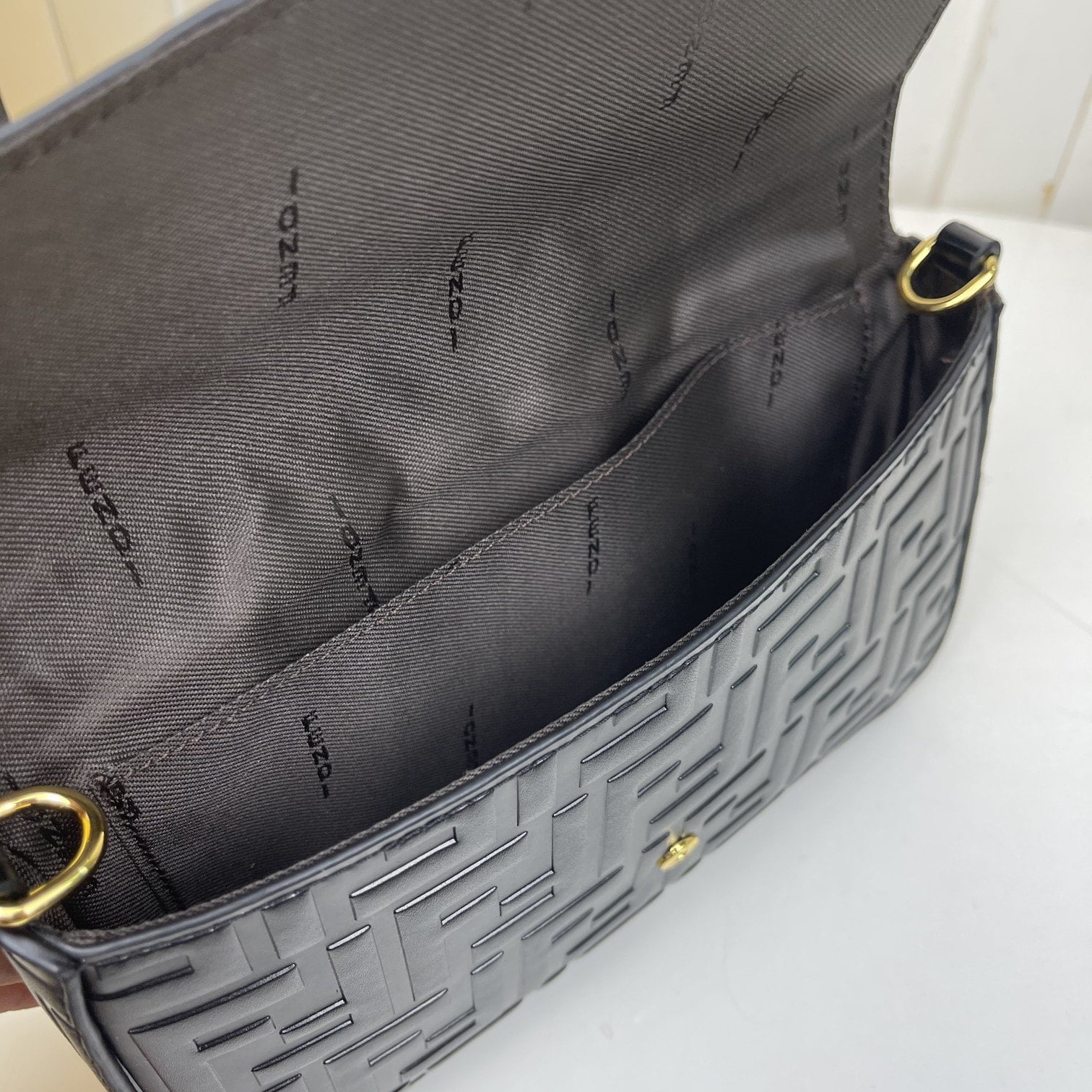 【FENDI】 Fendi’s latest geometric clamshell mini handbag with hardware accessories including the Fendi logo. Adopts the button opening and closing type, with two detachable inner bags – one with zipper, one with 8 card slots. Detachable chain strap. Lining with flat pockets. Black hand relief FF print. Gold metal pieces;
