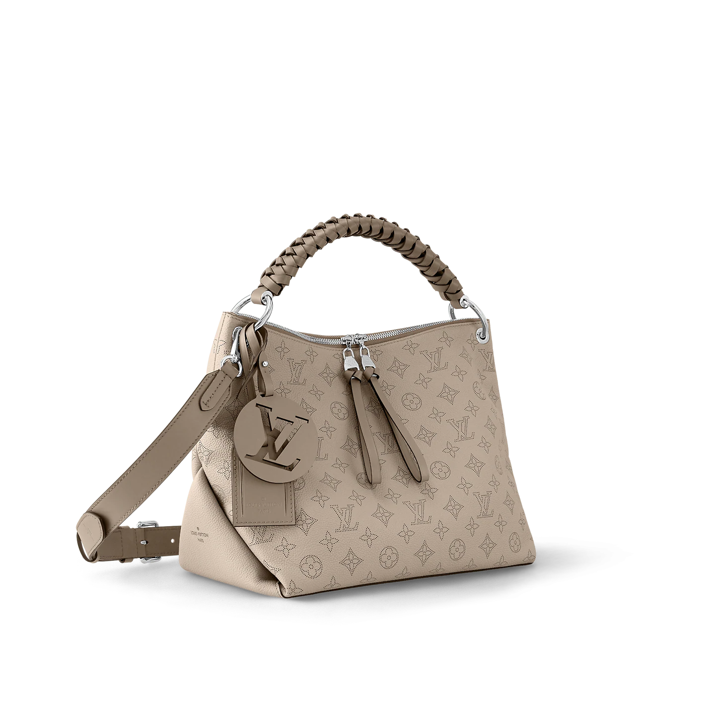 The Beaubourg Hobo MM bag is made from Mahina calf leather perforated with the Monogram pattern. It boasts a stylishly braided-leather top handle. with hand-painted edge-dyeing along the braids. The leather zip pulls and large LV charm sign the bag. A detachable. wide leather strap means that this supple bag feels comfortable against the body.