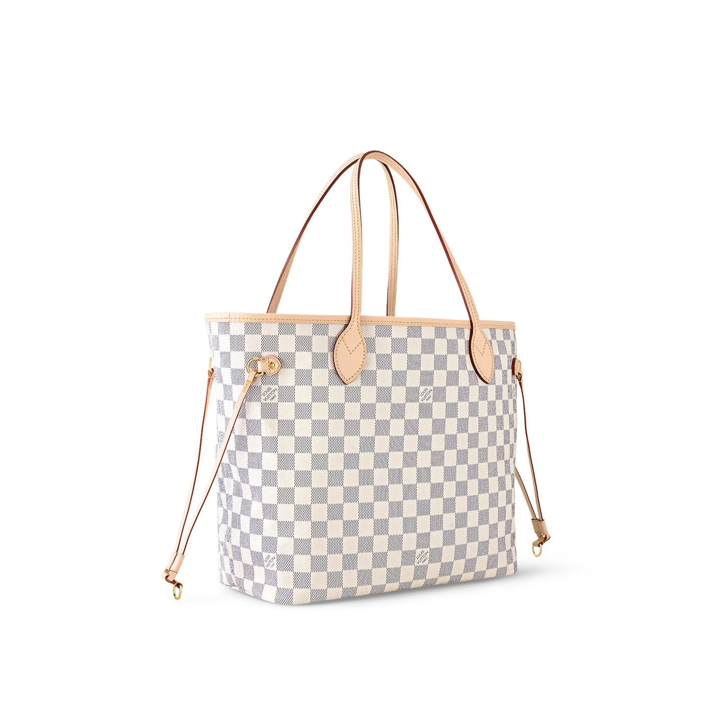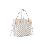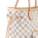 The Neverfull MM tote unites timeless design with heritage details. Made from fresh Damier Azur canvas with natural cowhide trim. it is roomy yet not bulky. with side laces that cinch for a sleek allure or loosen for a casual look. The slim leather handles slip easily over the shoulder or arm. Lined in colorful textile. it features a removable pouch which can be used as a clutch or an extra pocket.