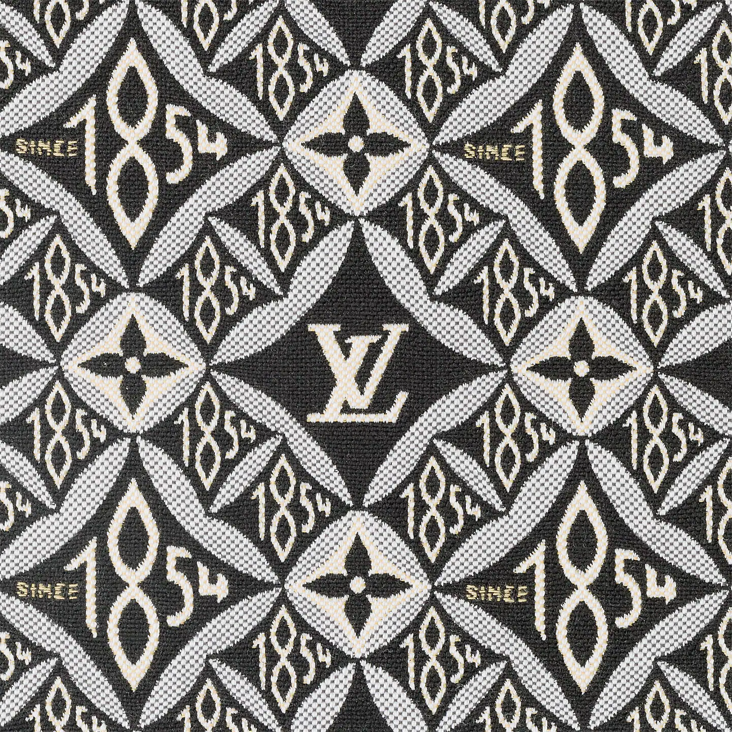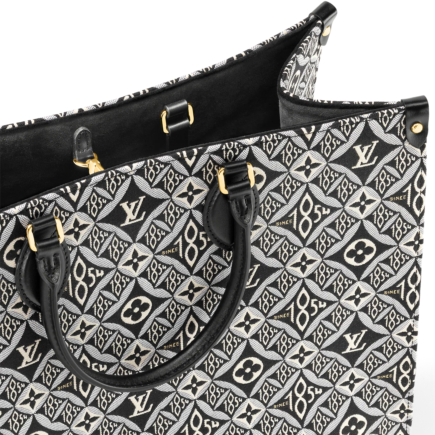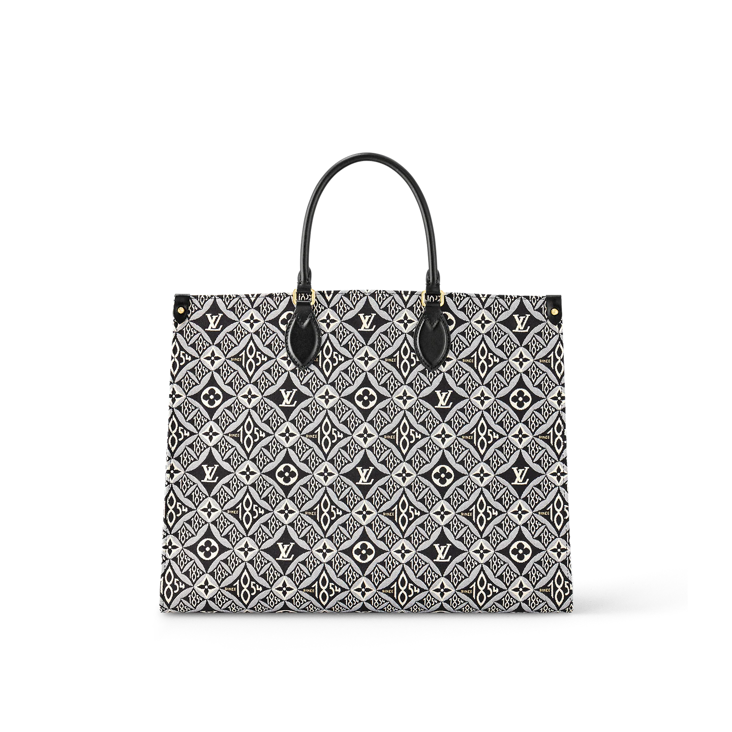 Nicolas Ghesqui??re brings his new Jacquard Since 1854 textile onto the OnTheGo GM tote. This woven textile is inspired by vintage wallpaper patterns and features Monogram Flowers and the number 1854. the year of the House’s founding. With two sets of handles. long and short. and a spacious interior. this is a versatile everyday bag.