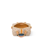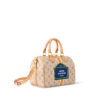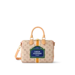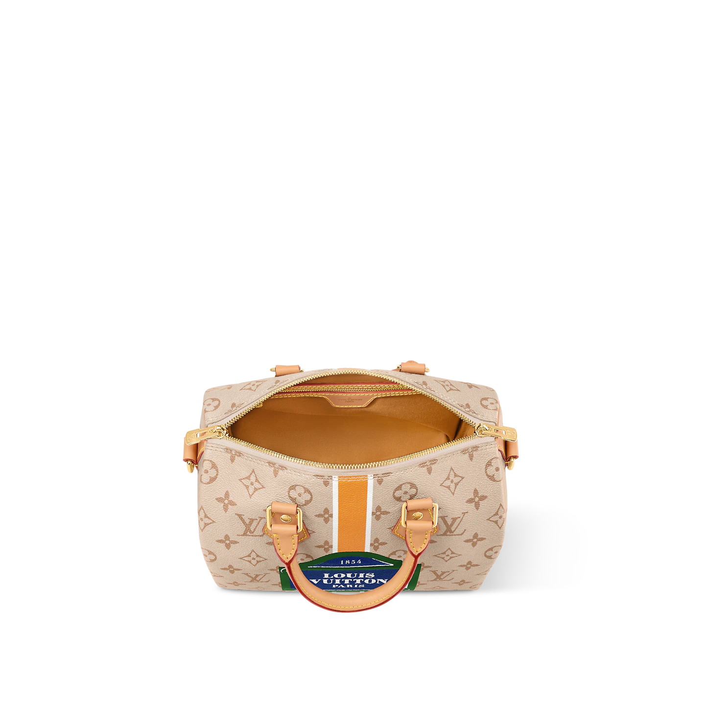 The Speedy Bandoulière 25’s emblematic shape is made from beige Monopaname canvas with a central vertical strip in white, ocher, and white, like those found on the House’s early trunks. In the center “Louis Vuitton Paris” in bold white typeface on a solid blue background is framed in green. Just like a typical Parisian street-sign.